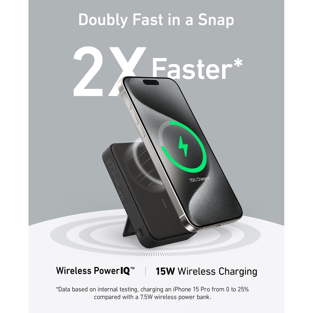 The Anker MagGo Power Bank (10K) brings Qi2 magnetic wireless charging and USB-C fast charging into a compact, high-capacity design. With 15 W ultra-fast wireless output and 27 W USB-C power delivery, you can recharge your iPhone 15 Pro quickly while keeping the power bank itself topped up. A built-in smart display and foldable stand add intelligence and convenience to everyday use.