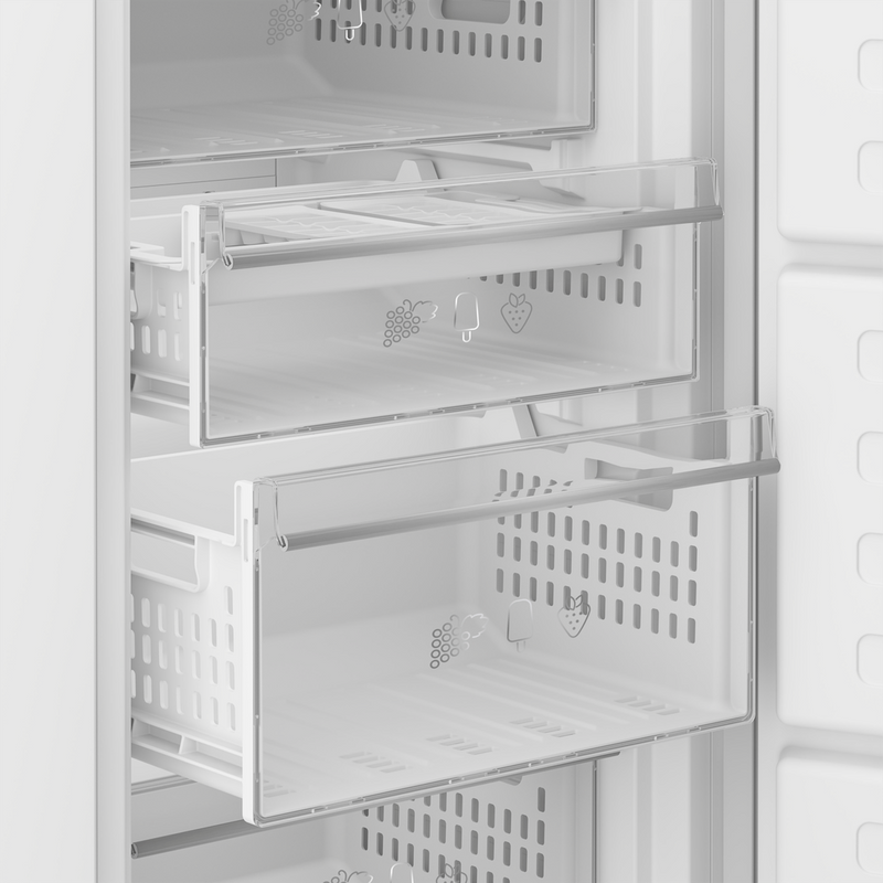 Say goodbye to manual defrosting thanks to its Frost Free technology, which prevents ice build-up and ensures consistent cooling. The Fast Freeze function rapidly lowers the temperature to preserve the nutritional value of your food. Designed with flexibility in mind, it features a reversible door and operates efficiently even in ambient temperatures as low as -15°C, making it suitable for garages or outbuildings. Additional features like the internal LED display, door open alarm, and slimline ice tray enhance convenience and usability.