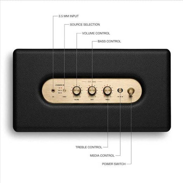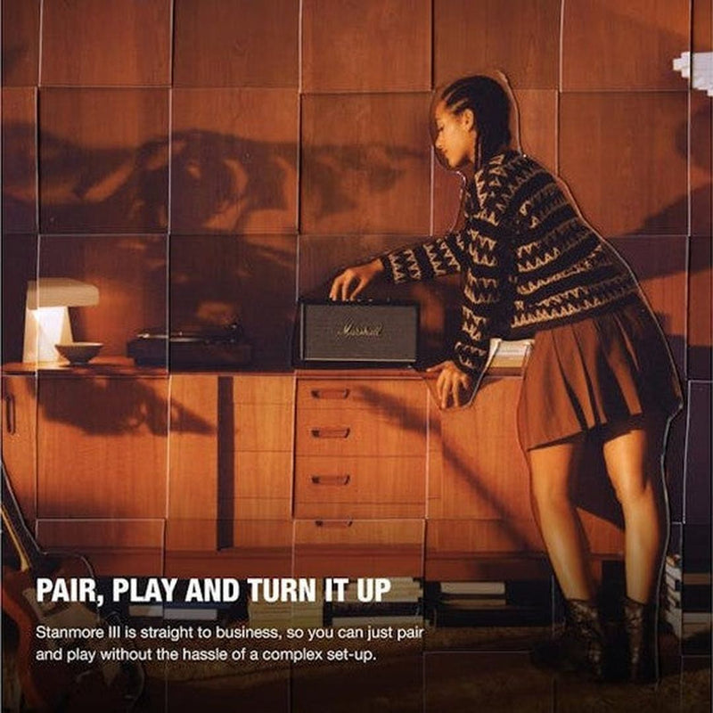 The Stanmore III features Marshall's bold design philosophy with its signature script logo and brass control knobs. Available in classic Black, vintage Cream, and relaxing Brown finishes, it makes a bold statement while complementing any space.