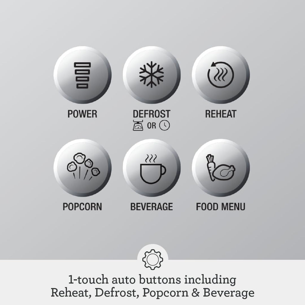 - One-touch auto buttons: Reheat, Defrost, Popcorn, and Beverage