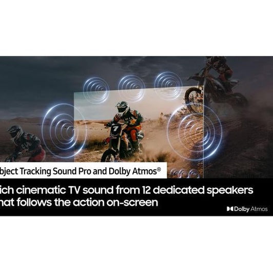 Enjoy smooth motion with 120 Hz refresh (up to 240 Hz in 4K via VRR), anti‑glare coating for bright rooms, and immersive Dolby Atmos sound—all in a sleek Infinity Air design with Wireless One Connect for a clutter-free setup.