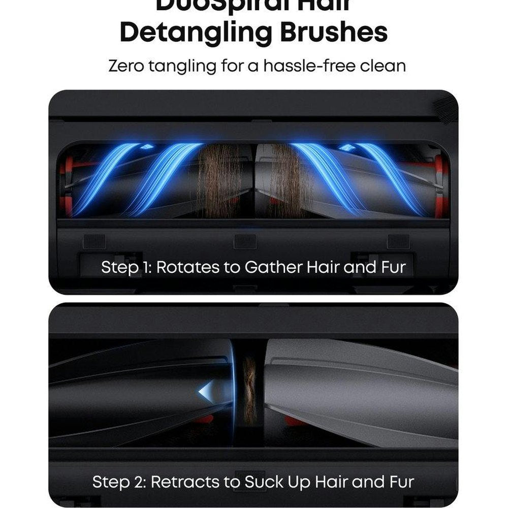 - DuoSpiral™ anti-tangle brushes and CornerRover™ arm for full edge coverage