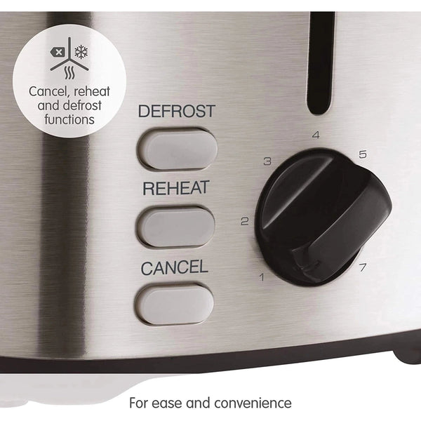 Easy to operate with variable browning control ensuring you get perfect toast, to your taste, every time. Defrost and reheat settings mean your new toaster will cater for every occasion, the removable crumb tray ensures that cleaning up is easy and cord storage allows you to neatly store your toaster away.