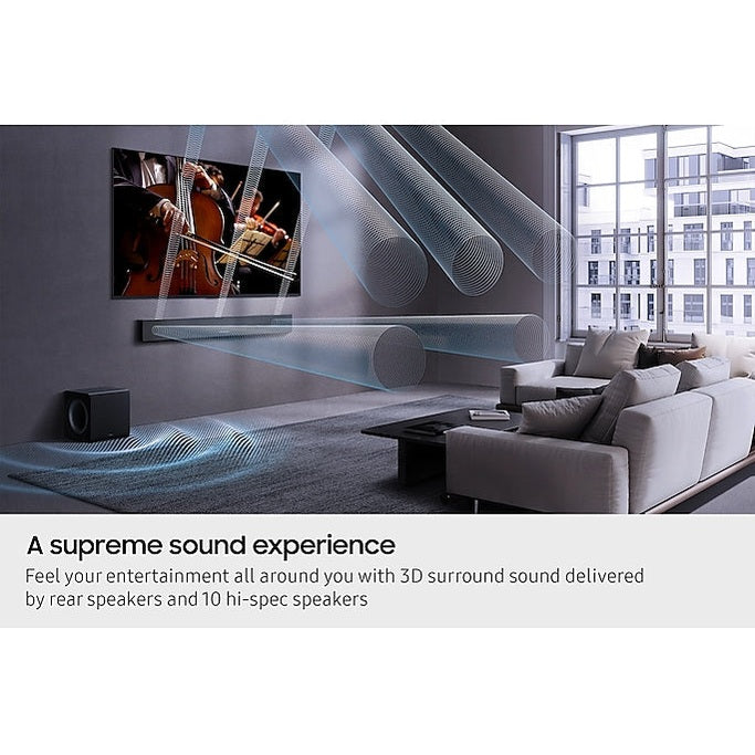 With a dedicated 3.1.2 setup featuring a wireless subwoofer and immersive Atmos-ready sound, plus smart tuning and voice clarity features, this soundbar puts depth, clarity, and control in perfect harmony. Seamless sync with Samsung TVs through Q‑Symphony ensures a unified audio experience.