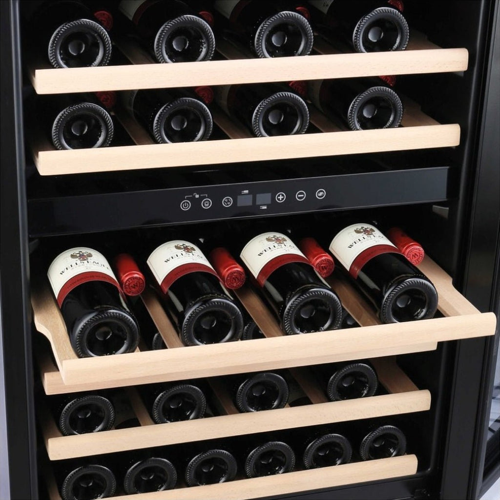 The AWC600BL is a 60cm freestanding wine cooler. Providing a huge capability within a sleek exterior. It offers the capacity to hold up to 46 bottles across two temperature controlled zones. Features include electronic temperature control and an over temperature alarm, which will help to keep wine in the perfect condition. This wine cooler is the ideal addition to any kitchen.