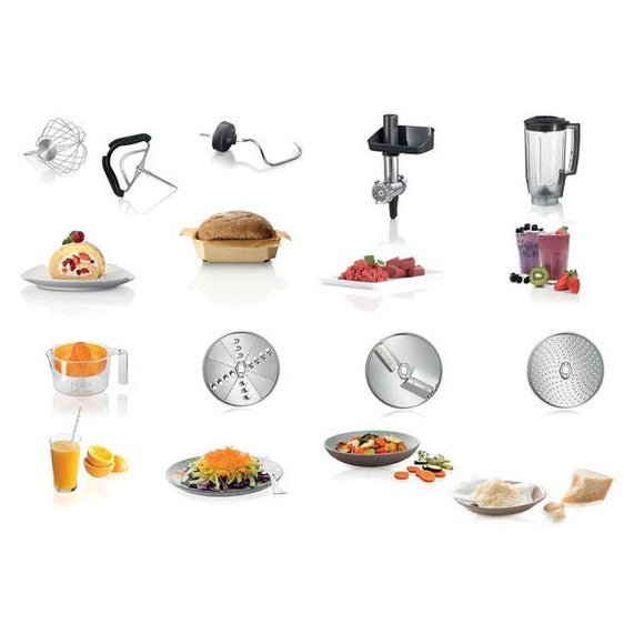 - Great multifunctionality thanks to professional patisserie set (professional beating whisk, professional flexible stirring whisk, kneading hook), continuous shredder with professional Supercut cutting disc, reversible shredding disc and grating disc